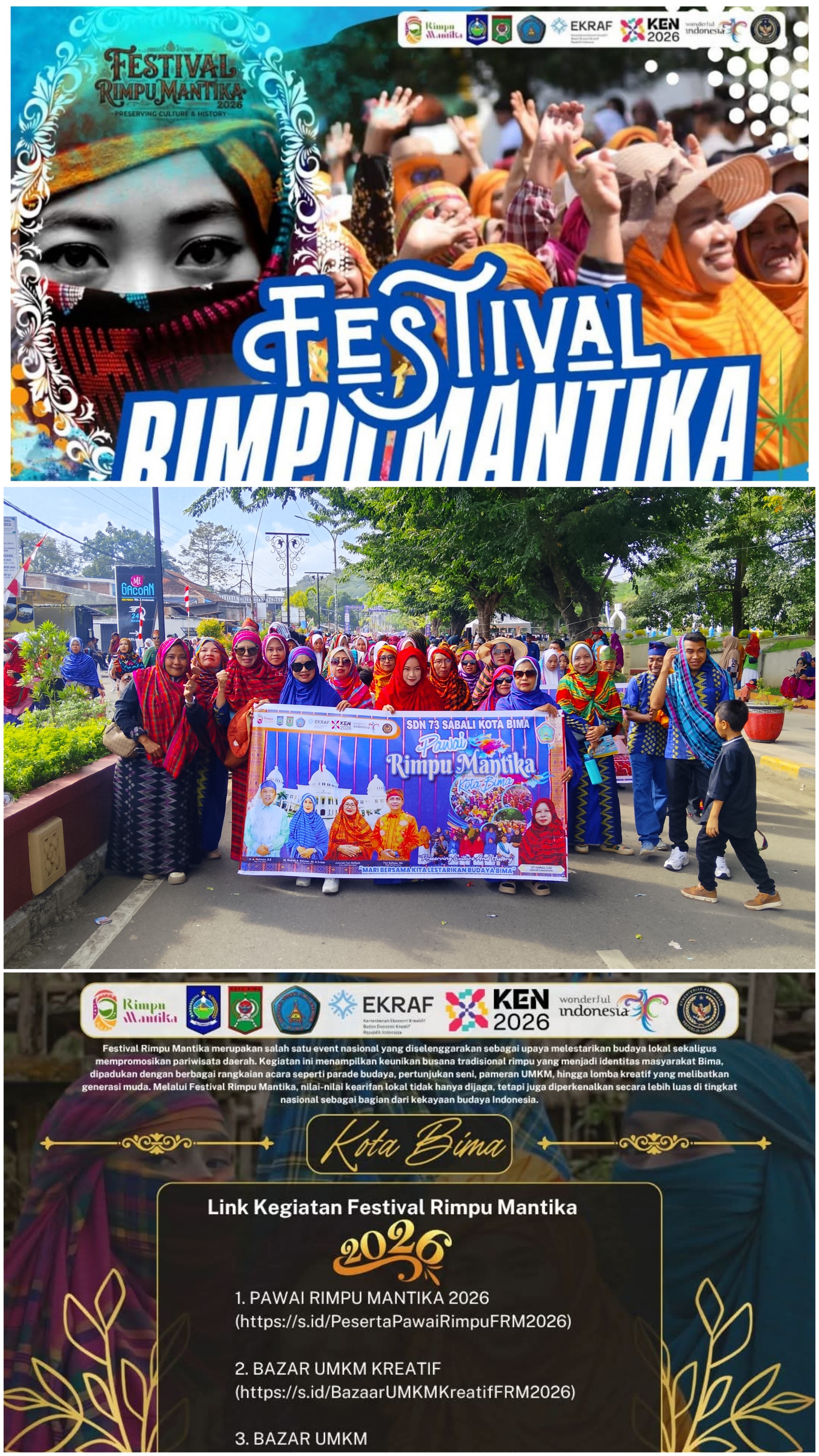 Kota Bima, Sabtu 25 April 2026 - Sekolah Dasar Negeri (SDN) 73 Sabali turut ambil bagian dalam memeriahkan Festival Rimpu Mantika yang diselenggarakan di Kota Bima. Kegiatan ini diikuti dengan penuh antusias oleh para guru yang mengenakan busana rimpu sebagai bentuk pelestarian budaya daerah.
